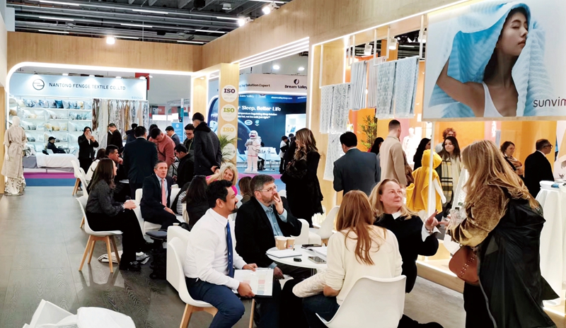 1月14日,2025年法兰克福国际家用及商用纺织品展览会在德国法兰克福展览中心拉开帷幕。本次展会以“持续未来”为主题,利用孚日特有的GCS技术,应用绿色环保材料以及循环可再生材料,通过可持续设计,采用科技创新减低碳排放量,特殊柔软的加工技术,使产品手感柔软蓬松,吸水性好,给消费者带来舒适体验,健康生活。差异化的产品设计,吸引了众多前来观展的新老客户,他们纷纷对孚日的产品表现出浓厚的兴趣,不断坐下来进行询问交流洽谈,为孚日集团抓好全年接单工作开了一个好头。