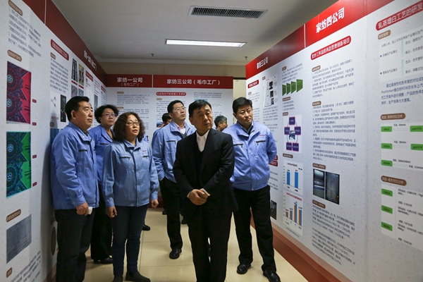 在产品展示区,集团领导对家纺一公司双面异效应浮雕花型多层织物,家纺三公司涤纶色纤产品,和家纺四公司类似棒针交织组织的机织毛巾等新材料、新组织的应用表示了赞赏。