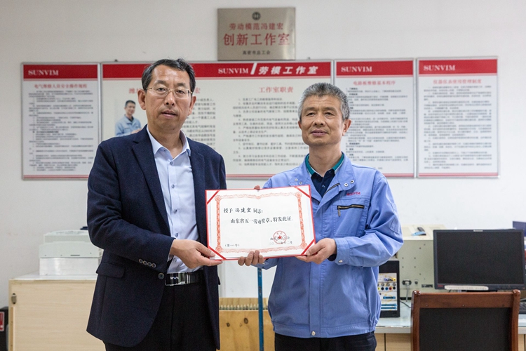 2021年5月19日,高密市总工会党组书记、常务副主席宋进岭来到孚日集团冯建宏工作室,将山东省总工会“齐鲁工匠创新工作室”的牌匾授予冯建宏,并祝贺冯建宏本人荣获“山东省五一劳动奖章”。