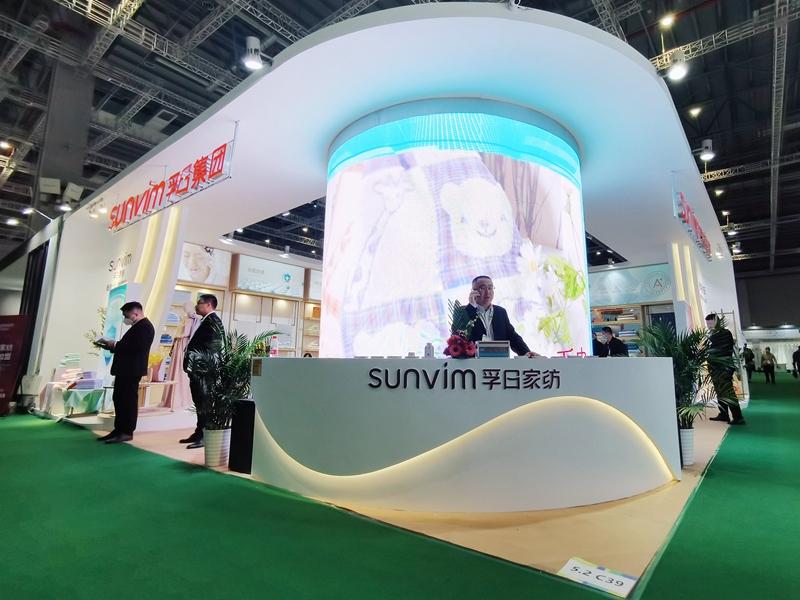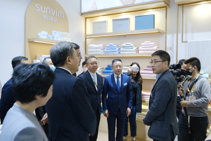 (图为孚日集团副总经理、国内品牌运营总负责人孙浩博带队参加上海春夏家纺展,中国纺织工业联合会会长孙瑞哲、中国纺织工业联合会副会长、中国家用纺织品行业协会监事长杨兆华参观孚日展位)
